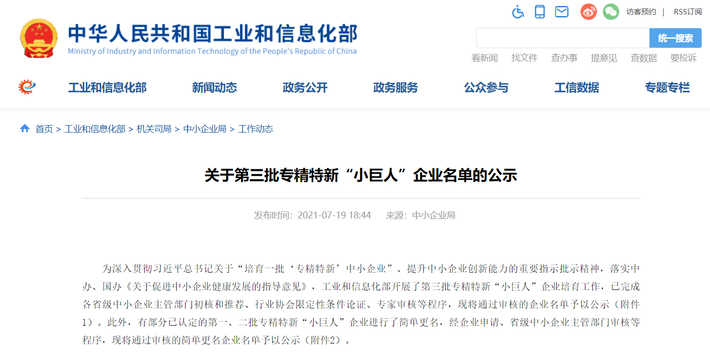 7月19日,工業(yè)和信息化部中小企業(yè)局發(fā)布了《關于第三批專精特新“小巨人”企業(yè)名單的公示》,寶太生物上榜!